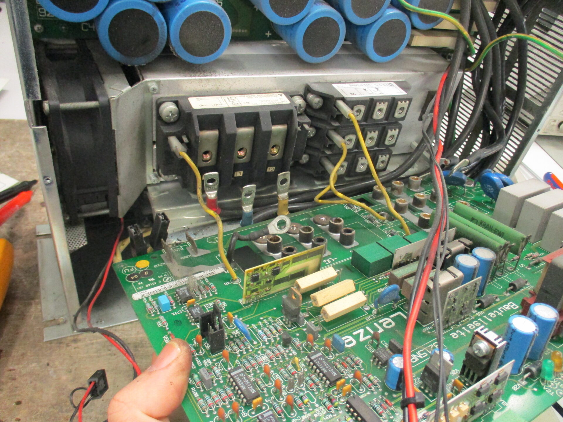 Una delle aree di guasto più comuni nel Lenze 9200 è il circuito intermedio del DC link. Nei dispositivi che funzionano da diversi anni, è naturale che i condensatori elettrolitici si degradino, causando un aumento del ripple di tensione e errori di sottotensione o sovratensione. L’aumento del ripple di tensione mette a dura prova i moduli IGBT e può accelerarne il guasto.
